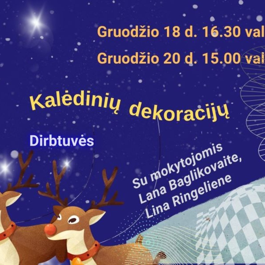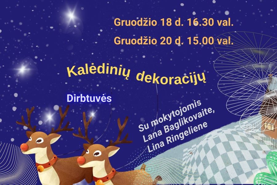 Gal dar neturite paruošę dovanėlių gruodžio šventėms, bus puiki proga jas sukurti patiems. Tęsiame tradicijas ir kviečiame visus mokinius į Kalėdinių dekoracijų dirbtuves! Gruodžio 18 d. 16.30 val. dirbtuves ves dailės, keramikos mokytojos Lana Baglikovaitė ir gruodžio 20 d. 15.00 val. taikomosiso dailės, dailės istorijos Lina Ringelienė. Pasitelkę išmonę ir skirtingas medžiagas ruošimės artėjančioms šventėms.