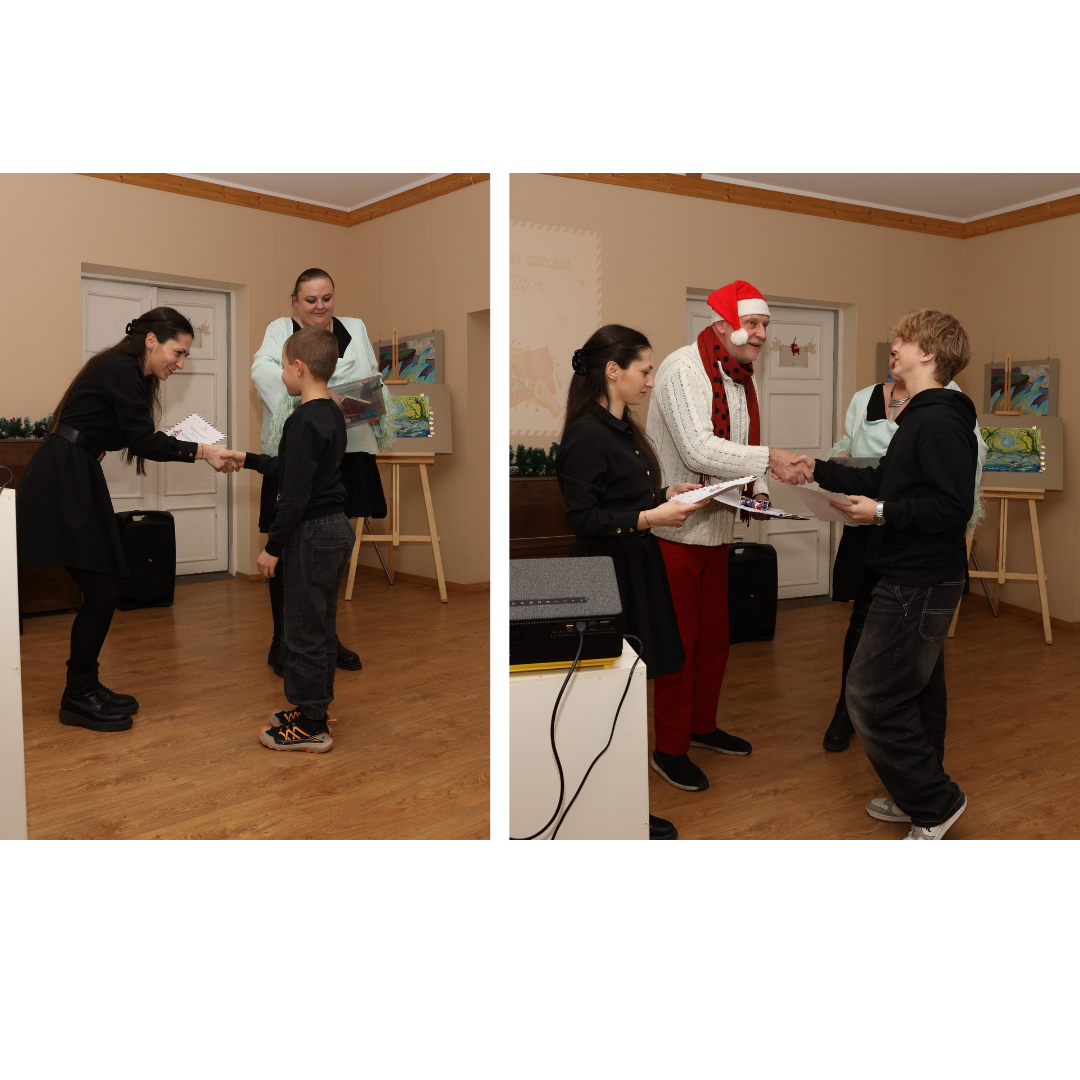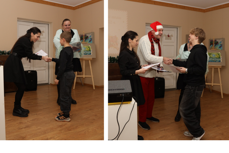 Dailės mokytoja Gražina Aleksandra Škikūnaitė įteikė nominacijas ir padėkas mokiniams už dalyvavimą dailės parodose. Taip pat sveikinome nugalėtojus ir padėkas įteikėme konkurso „Kalėdinis atvirukas 2025 m.“ dalyviams.
