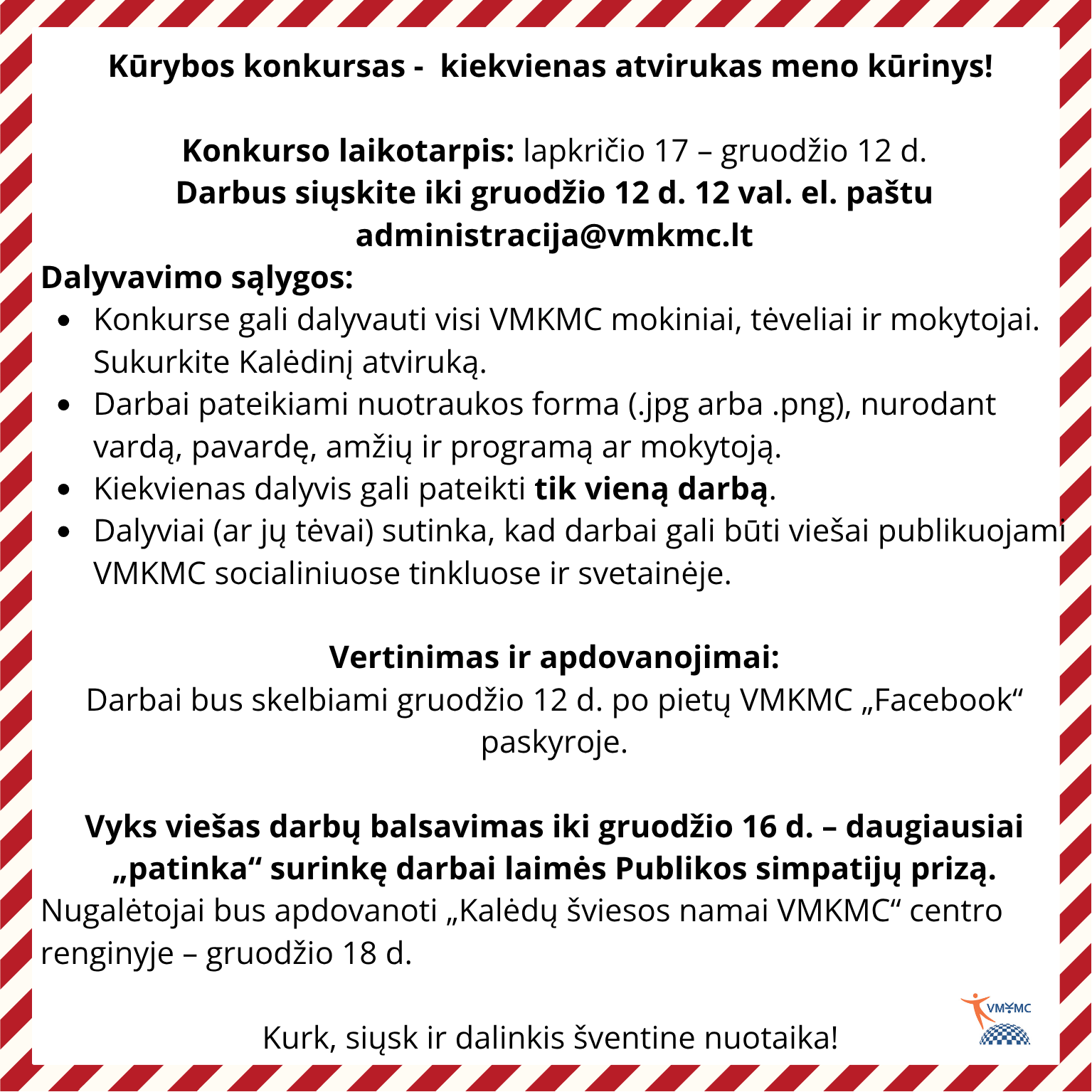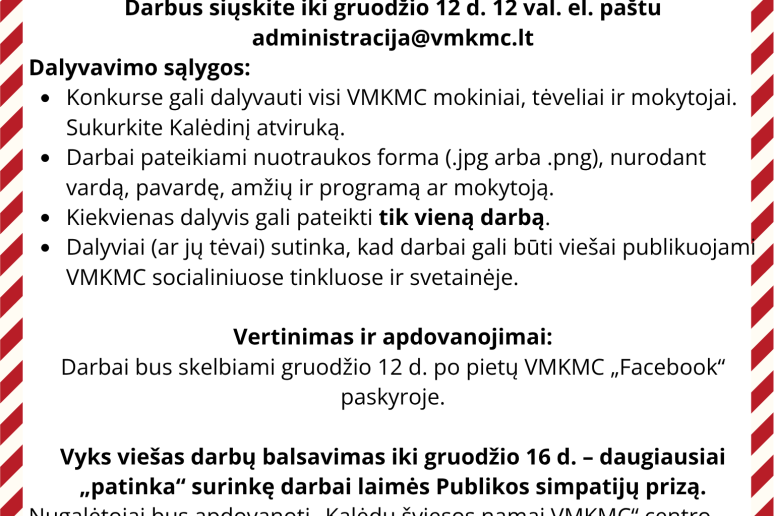 Darbus siųskite iki gruodžio 12 d. 12 val. el. paštu administracija@vmkmc.lt