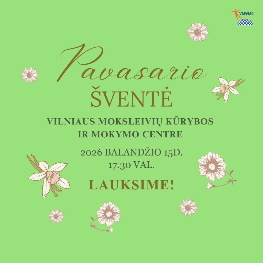 Vilniaus moksleivių kūrybos ir mokymo centras maloniai kviečia Jus 2026 m. balandžio 15 d., 17:30 val. kartu sutikti gražiausią metų laiką "Pavasario šventėje", kupinoje muzikos, spalvų ir džiugių akimirkų.