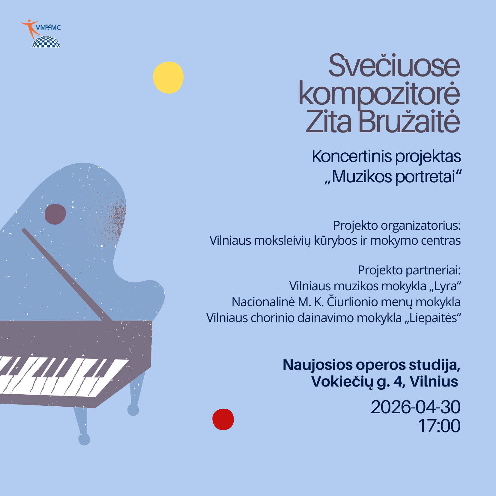 Balandžio 30 d. 17 val. maloniai kviečiame į projekto "Muzikos portretai", koncertą „Svečiuose kompozitorė Zita Bružaitė“, kuris vyks Naujosios operos studijoje (Vokiečių g. 4, Vilnius).