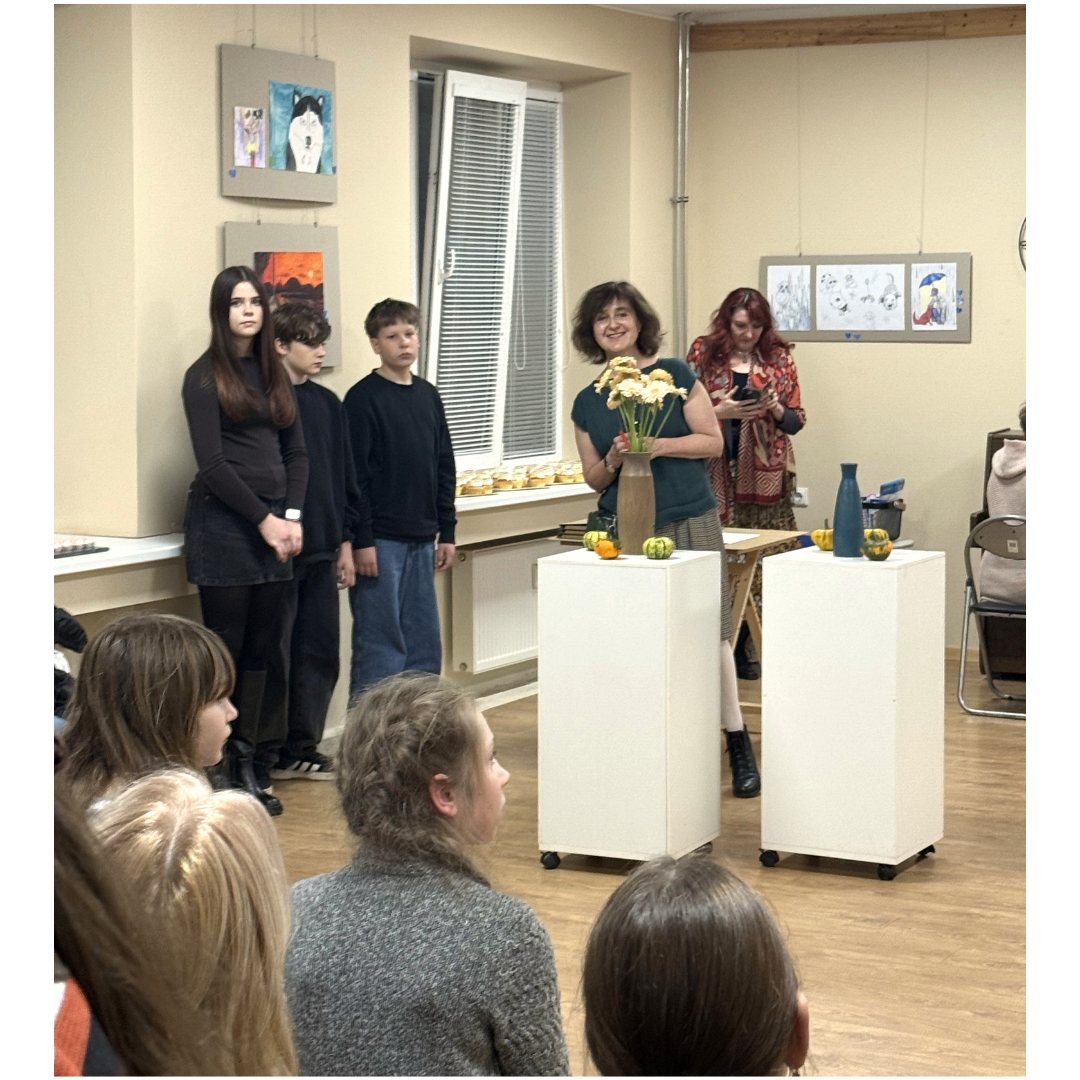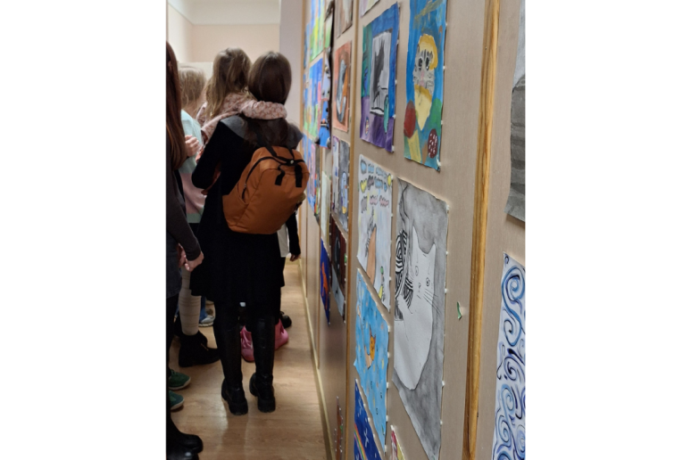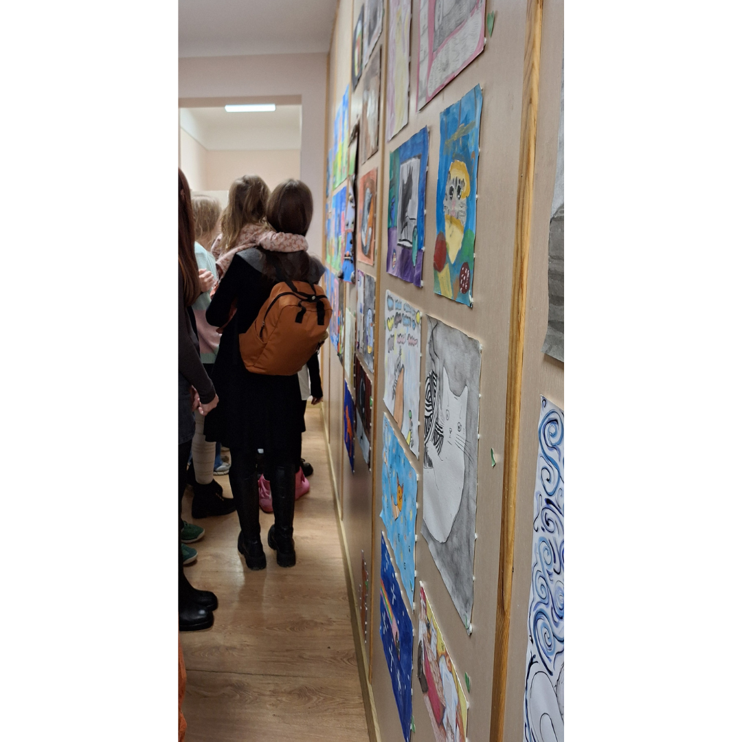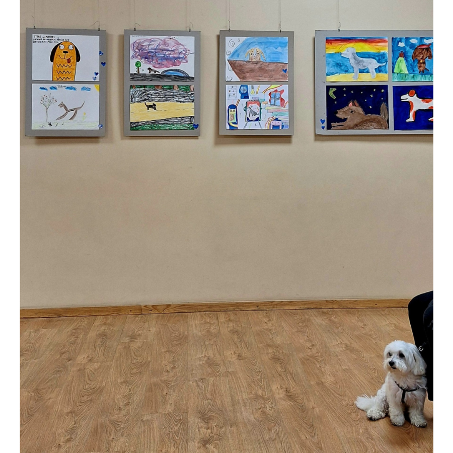 Jaunieji dailininkai, jų tėveliai, mokytojai ir net vienas keturkojis svečias džiaugėsi kūriniais, muzika, skanėstais ir mažomis dovanomis.