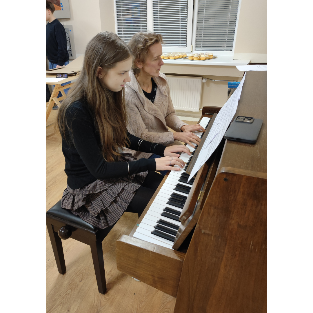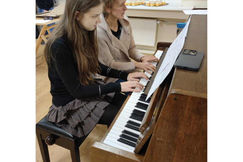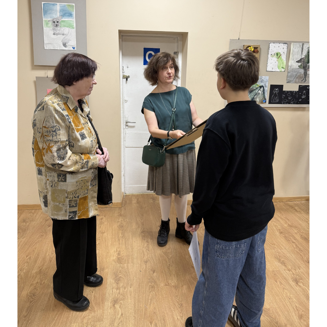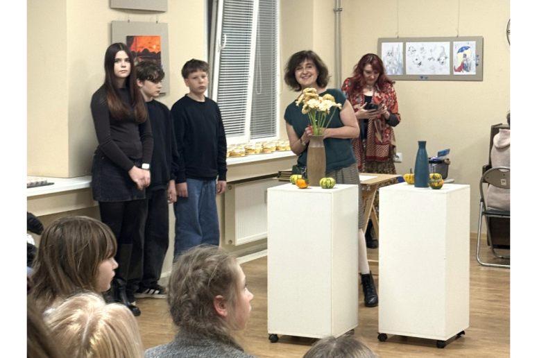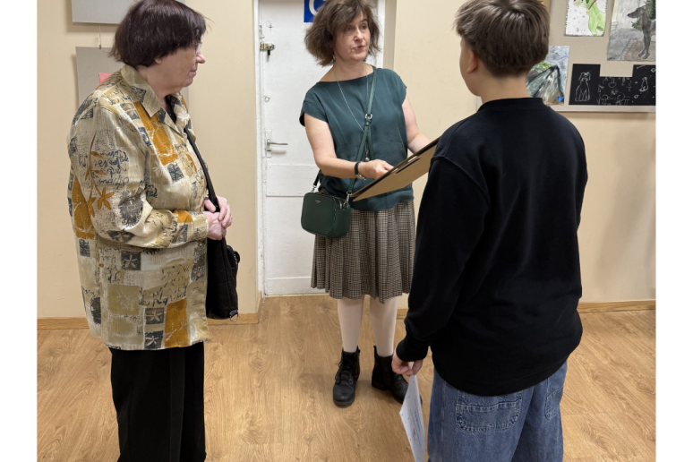 Jaunieji dailininkai, jų tėveliai, mokytojai ir net vienas keturkojis svečias džiaugėsi kūriniais, muzika, skanėstais ir mažomis dovanomis.